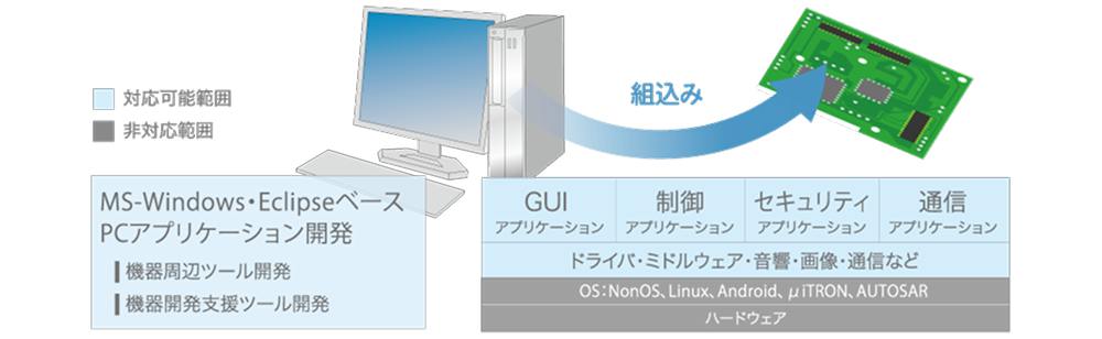 アプリケーション開発~ドライバ/ミドルウェア開発も対応可能です。