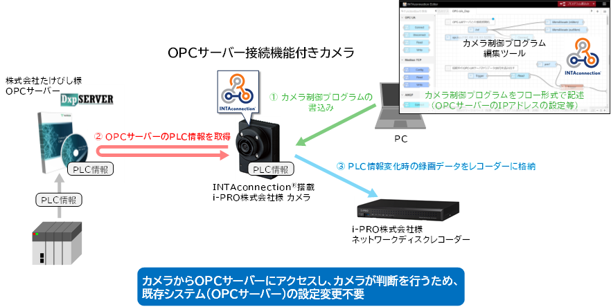 Connected PLCを搭載したi-PRO株式会社様製カメラから株式会社たけびし様の「デバイスエクスプローラ OPCサーバー」(以下、OPCサーバー)に対して直接通信を行うことによって、OPCサーバーの設定等を追加/変更することなくカメラとの連携を行うことが可能となります。