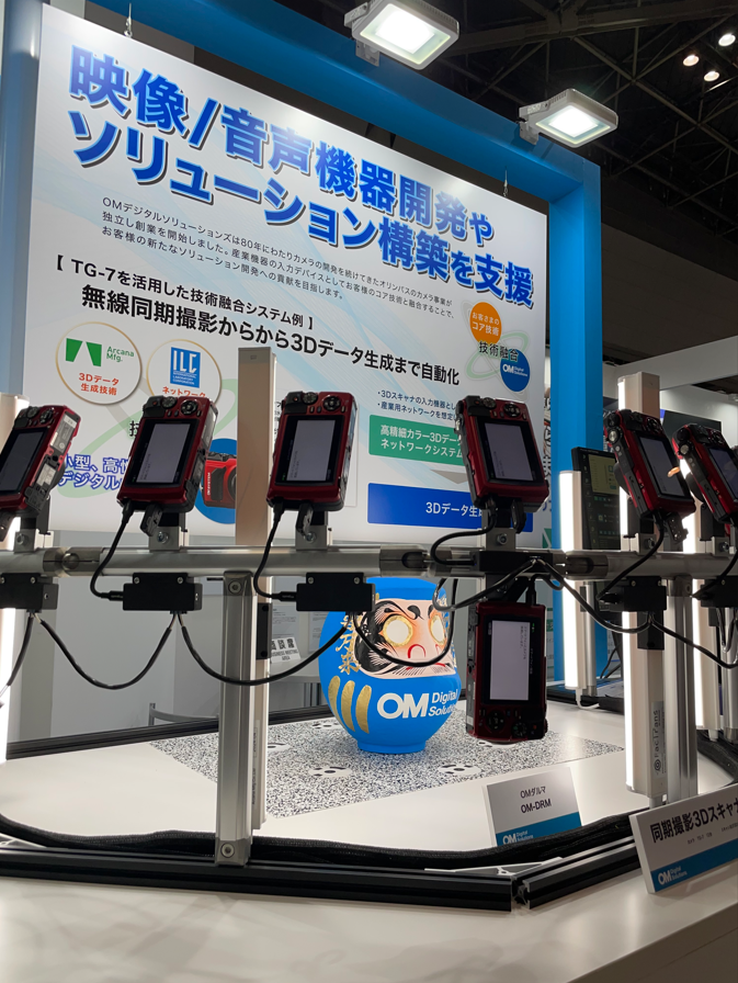 展示では特注のだるまを準備し、同期したカメラで撮影し、だるまの3Dモデルを約1分で生成するデモを行いました。 このシステムは、OMデジタルソリューションズ株式会社様のTough TG-7のWi-Fi通信機能を利用し、12台のカメラとPCをネットワーク接続して操作し、同時撮影後に3Dデータを自動生成するものです。