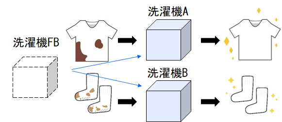 洗濯機という設計図をFBとすると、洗濯機FBのインスタンスを2つ作り、洗濯機A、洗濯機Bという名前にします。 同じ機能を持った洗濯機が2つ用意できました。それぞれに別のものを入れて洗濯ができるので、服と靴下を入れて、それぞれのパラメータをセットして洗濯します。 処理が完了すると、きれいになった服と靴下が出力されます。![]() |
