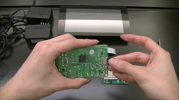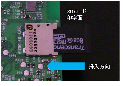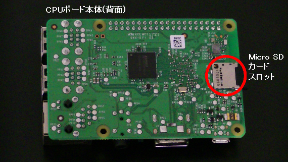 2-1.SDカードの挿入 2-1-1.CPUボード本体の背面にあるMicro SDカードスロットの位置(下図参照)を確認してください。 2-1-2.SDカードの印字のある面を上にし、Micro SDカードスロットにしっかり挿入します。 Micro SDカードスロット周辺 拡大 2-1-2.SDカードが、Micro SDカードスロットの奥まで挿入されていることを確認してください。 手順2-1を行った動画です。