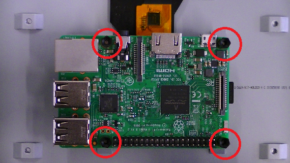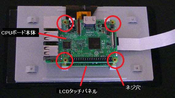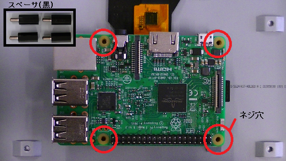 3-2.CPUボード本体とLCDタッチパネルを装着 3-2-1.CPUボード本体とLCDタッチパネルのネジ穴の位置が揃うように重ねます。 3-2-2.四隅のネジ穴にスペーサ(黒)を取り付けます。※過度な力を加えると破損の恐れがありますので、注意してください。 取付け位置 取付け後