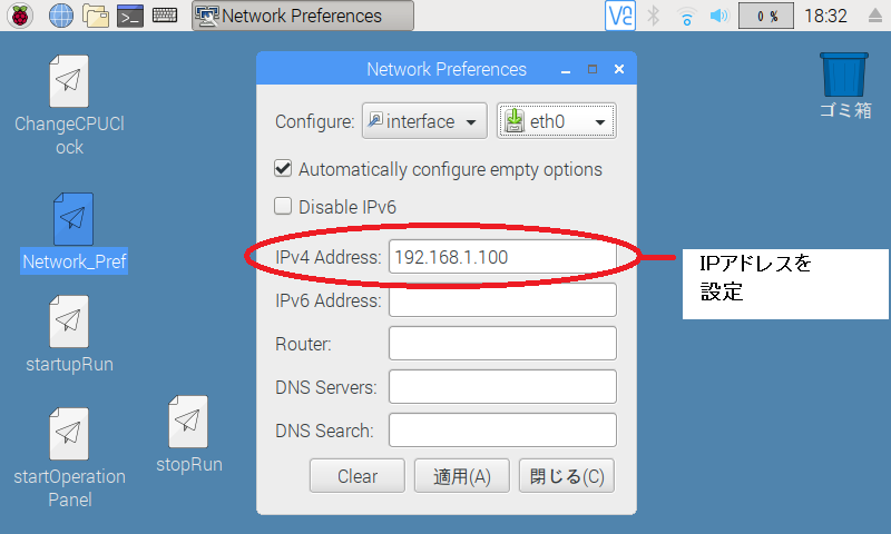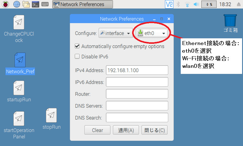 5-2-2.Ethernet接続される方は「eth0」を選択、Wi-Fi接続される方は「wlan0」を選択します。