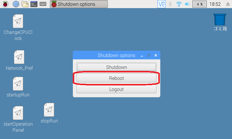 5-3.ILC AIR Kitの再起動 5-3-1.スタートメニューから[Shutdown]を選択します。 5-3-2.表示される[Shutdown options]ダイアログから、「Reboot」を選択します。 5-3-3.ILC AIR Kitが再起動します。